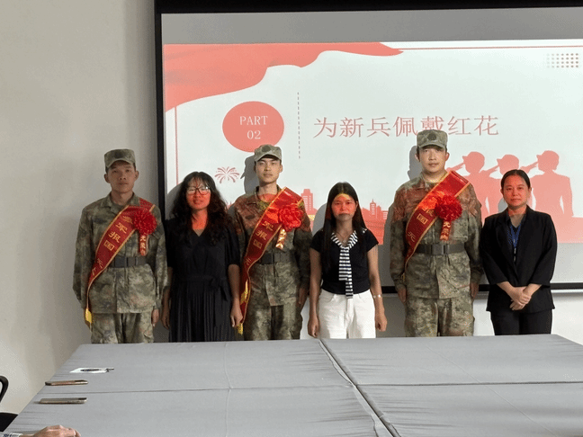 随后各位老师为入伍新兵佩戴了光荣花和入伍纪念品,鲜红的光荣花映衬着学子们坚毅的脸庞,也承载着学校的殷切期望。