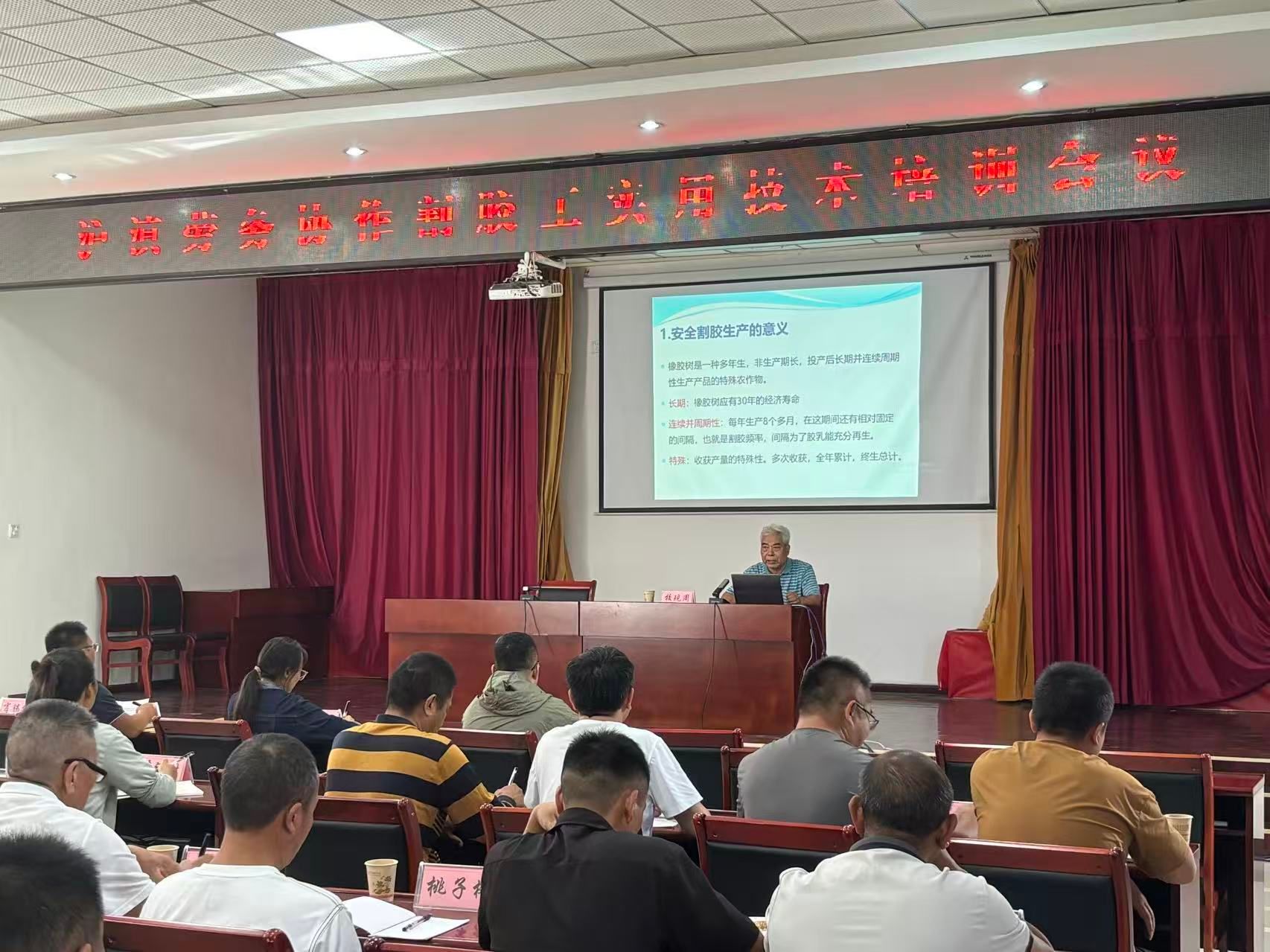 培训分为理论和实操两个部分。在理论培训中,校现周研究员重点阐述了橡胶树安全合理割胶的规程,以及不合理割胶与死皮形成原因的关联性。随后前往胶园开展实操培训,并解答大家的疑问,为景谷天然橡胶的割胶提供了较好的技术指导。