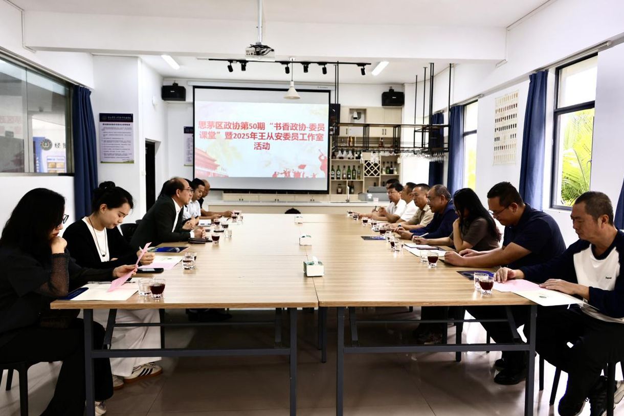 2025年10月15日下午,思茅区政协党组书记、主席李煜率队到学院开展以“推广普通话,铸牢中华民族共同体意识”为主题的第50期“书香政协·委员课堂”暨2025年王从安委员工作室活动。学院院长杨学虎、旅游与人文科学系主任李昳华及其他相关人员参加。