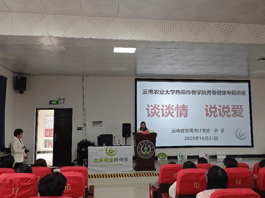 2025年10月26日,热带作物学院特邀普洱市计划生育协会专职副会长兼秘书长、学院客座教授许多,开展以“谈谈情说说爱”为主题的心理辅导专题讲座,助力青年学生构建健康情感观。200余名学生参加讲座。