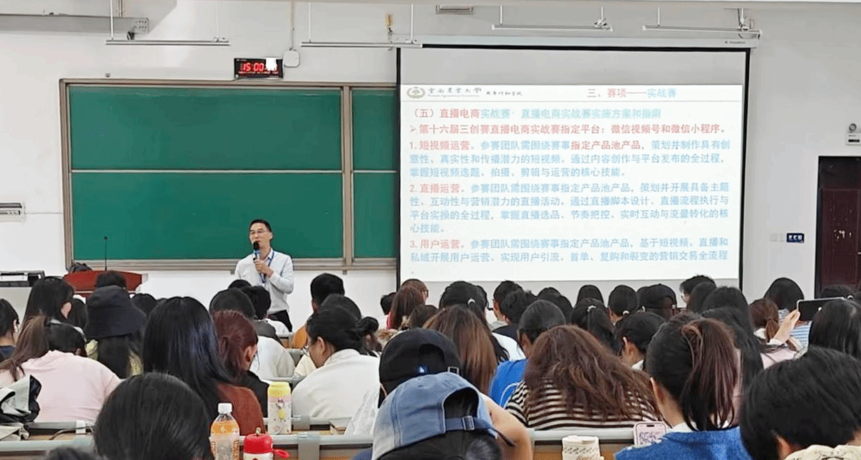 朱有才教授结合往届国家奖学金获得者、十佳学生等典型案例,强调“技能是练出来的,荣誉是拼出来的”,激励学生积极投入赛事实践。培训以学院往届获奖项目“打造云南双一流绿色食品牌数据分析报告——以普洱咖啡产业为例”等为切入点,系统解析备赛全流程,详细介绍了常规赛、直播电商、乡村振兴等九大赛道特点,建议学生认真研读比赛规则,立足云南农业特色,聚焦“三农”、跨境、非遗等方向选题,并强调优秀项目应兼具社会价值与市场需求,商业模式逻辑清晰,路演呈现突出创新与数据支撑。