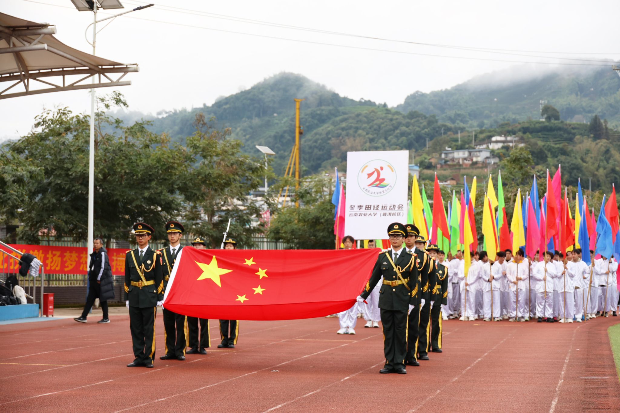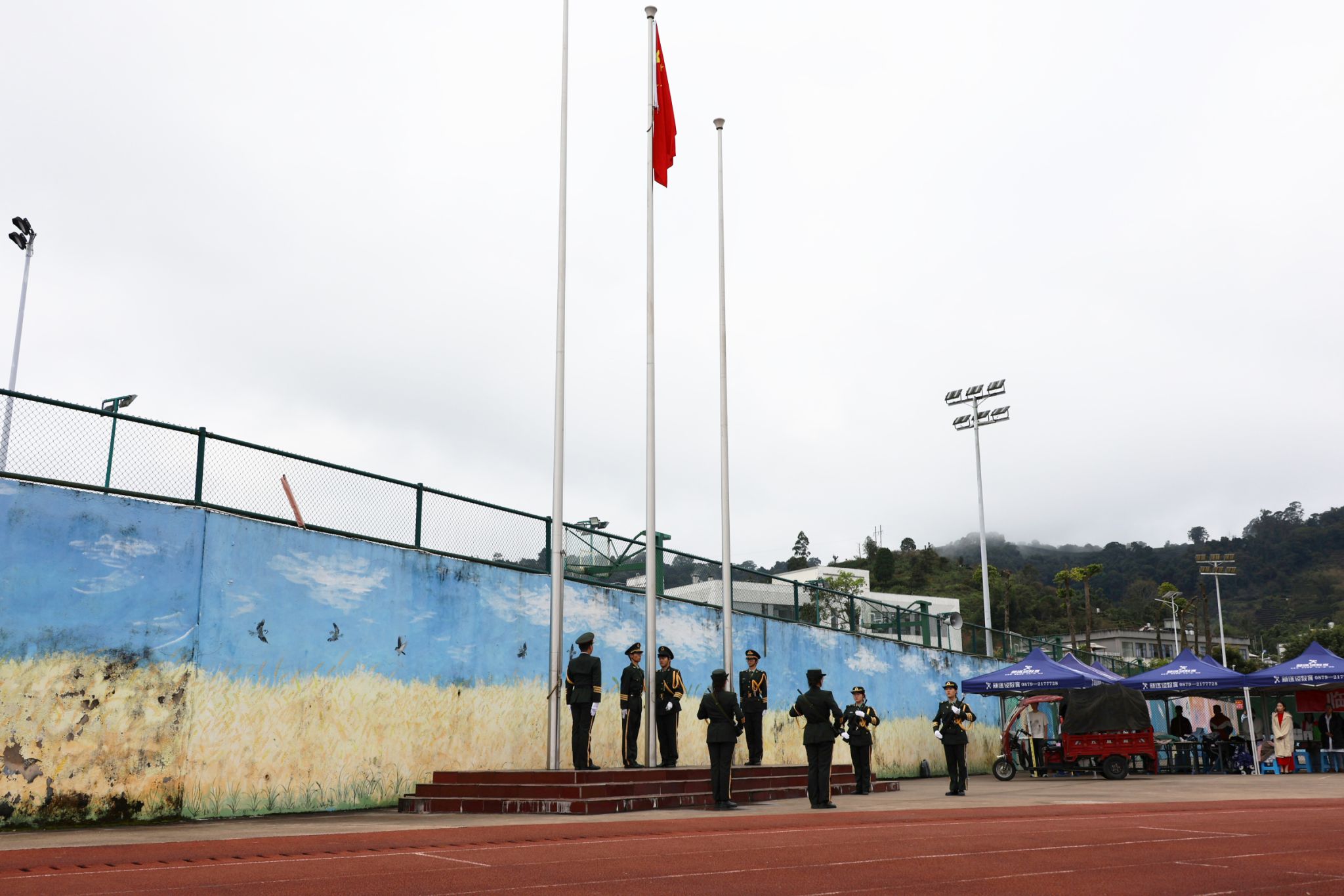 国旗护卫队、裁判员及各系部方阵、表演方队依次入场,有序站位。随着雄壮的国歌声响起,五星红旗在全体师生的注目礼中缓缓升起。