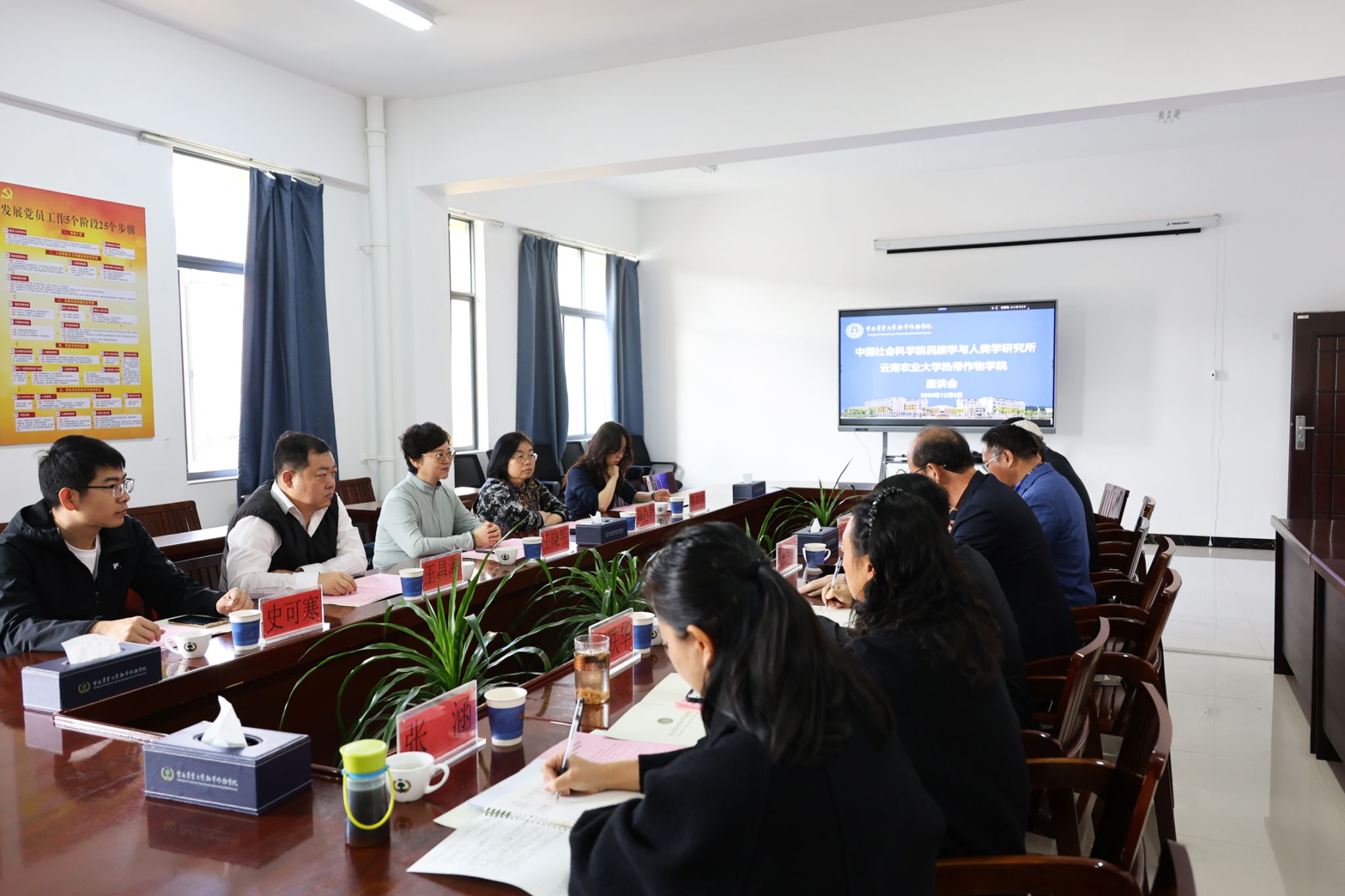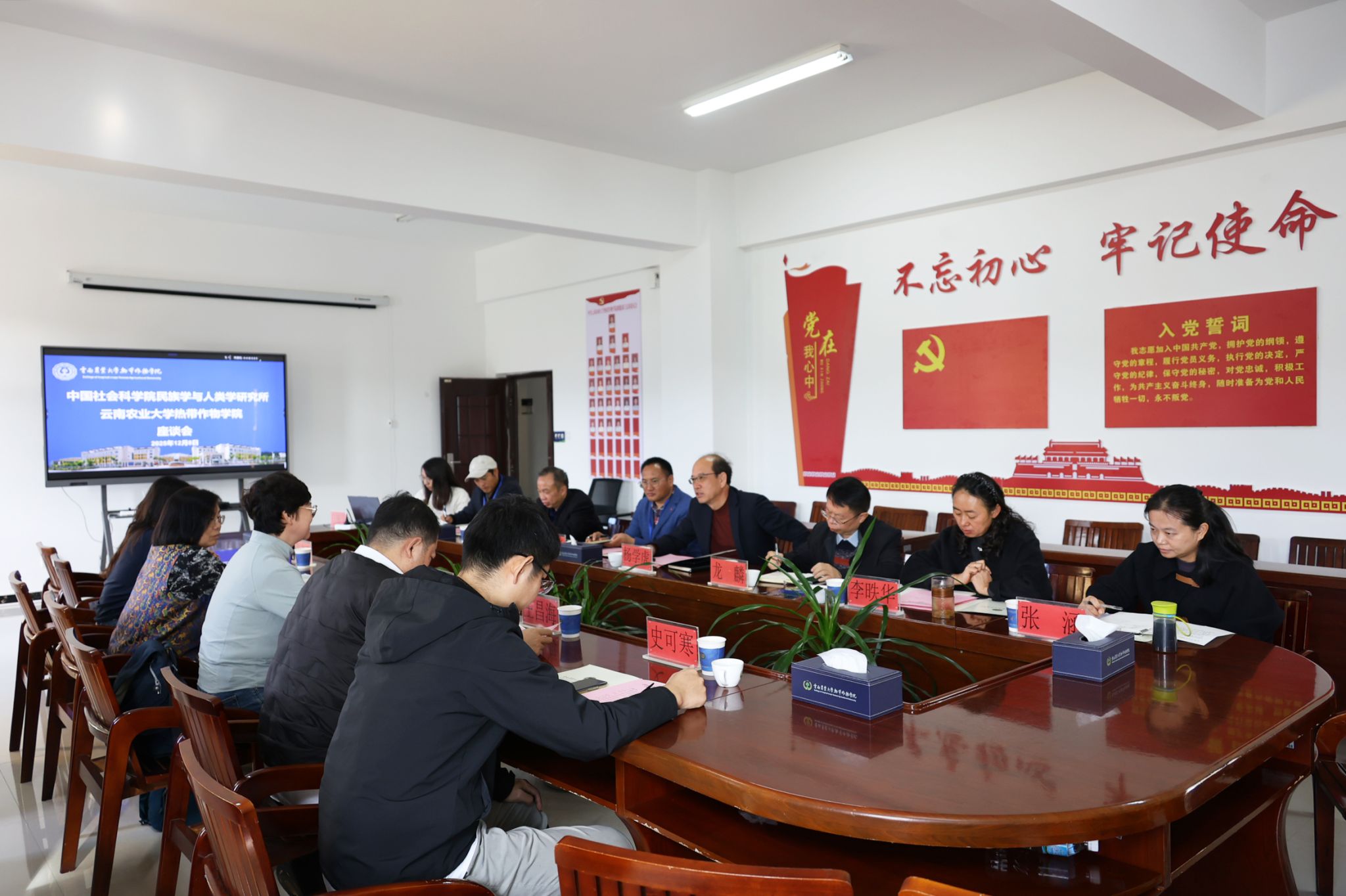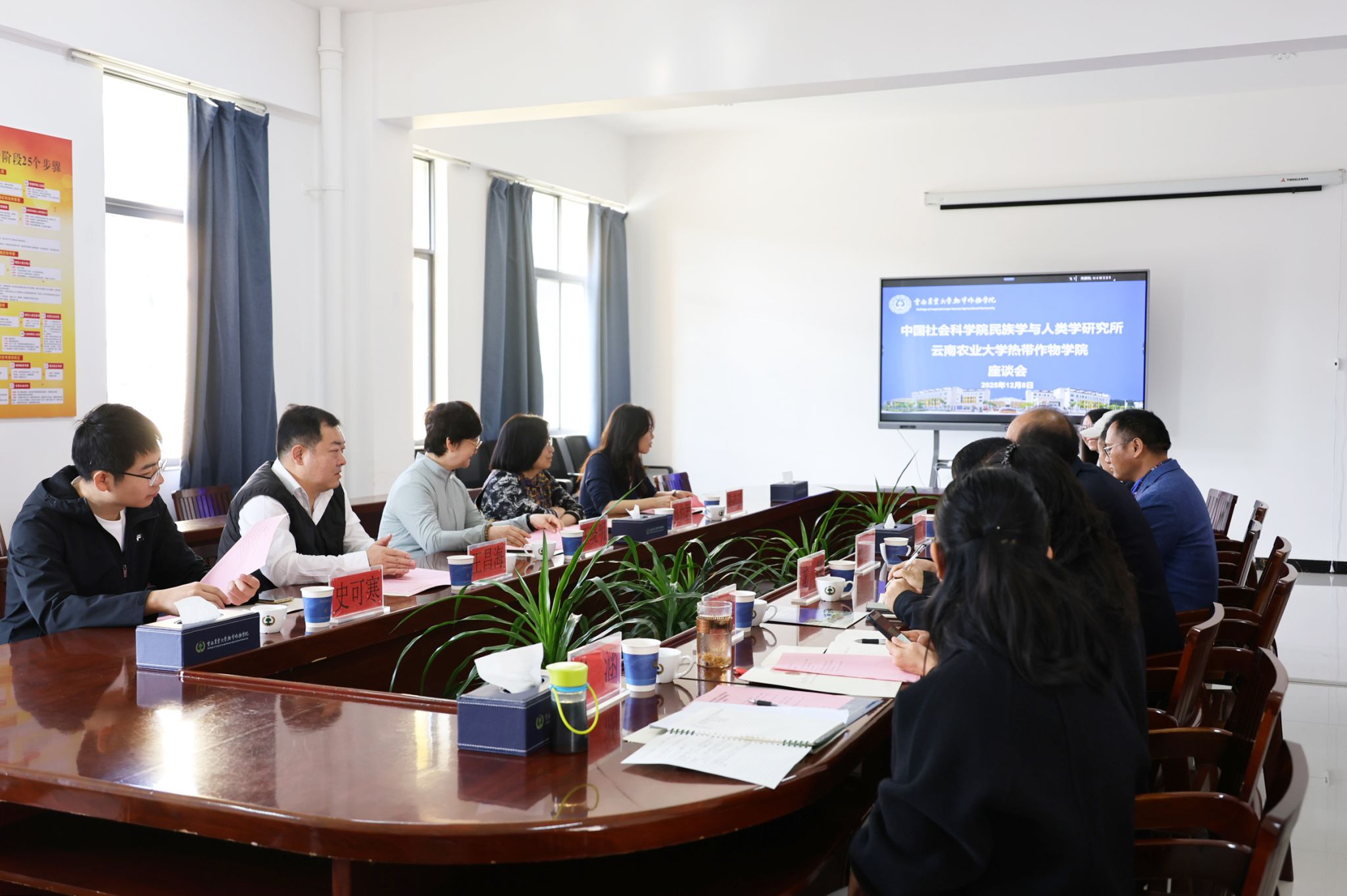 2025年12月8日上午,中国社会科学院民族学与人类学研究所王晓明教授、孙伯君研究员一行到热带作物学院调研座谈。学院院长杨学虎、普洱市文化和旅游局副局长龙麟、相关教师参加座谈会。座谈会由杨学虎主持。