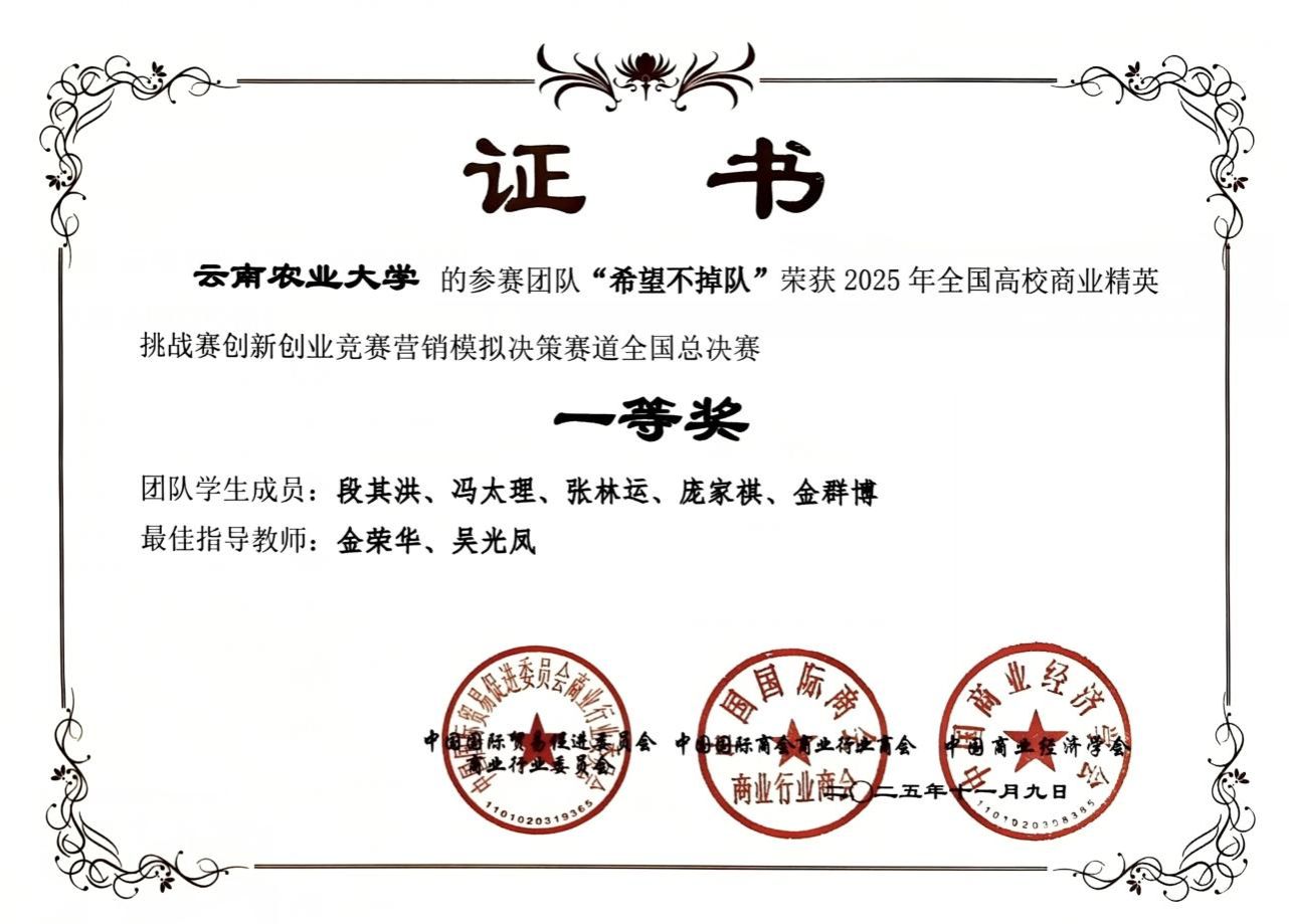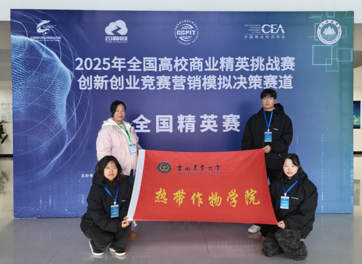 2025年11月,在全国高校商业精英挑战赛创新创业竞赛营销模拟决策赛道(全国总决赛)中,云南农业大学热带作物学院的“希望不掉队”团队从全国近800所高校、7000余支队伍中突围,斩获全国一等奖。