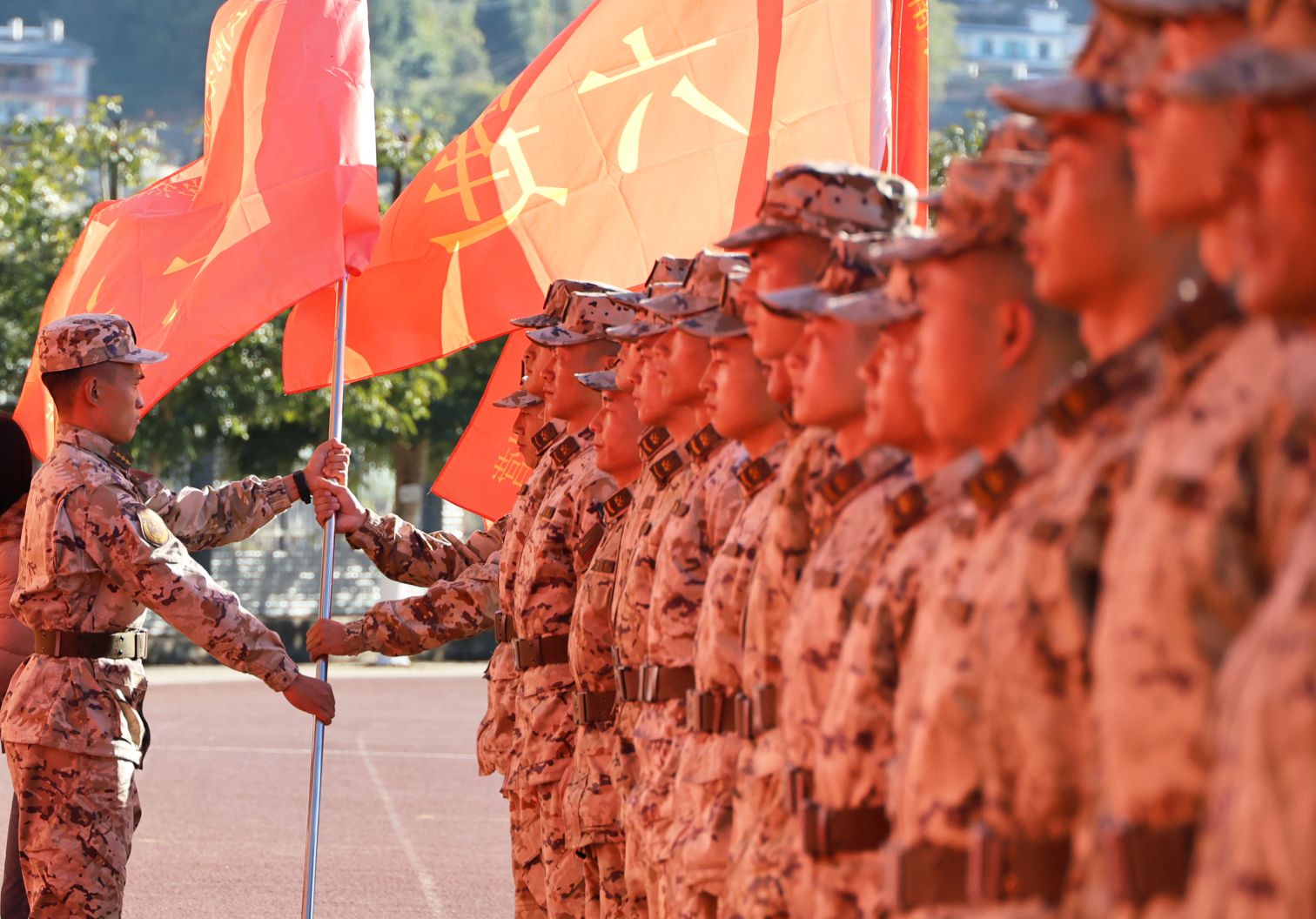 仪式上,武警普洱支队中队长、军训营营长罗坤上尉为各连队进行授旗。