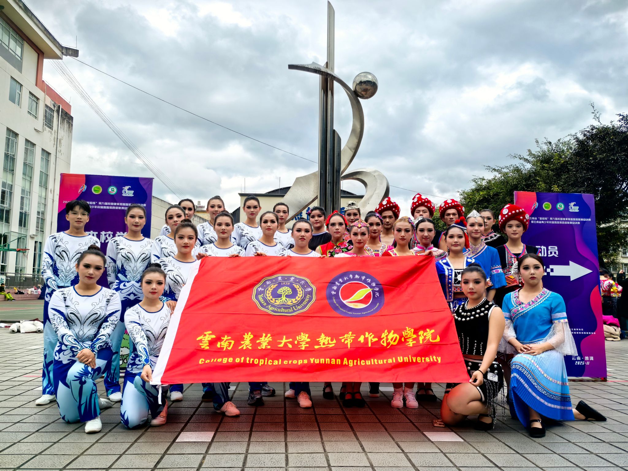 本次比赛中,由我院美育教研室与体育教研室联合组建的健美操队,在岩都、陶瑜老师的悉心指导下,派出薛云锴、常紫蕊、张博荣等32名队员代表云南农业大学参赛。赛场之上,教练员精心指导,运动员全力以赴,展现出良好的精神风貌与团队凝聚力,充分体现了我院师生热情、坚持、团结的优良品质。经过激烈角逐,我院代表队在自编动作《广场舞》项目中荣获第二名,在规定动作《2019年版健美操大众锻炼标准》3级项目中获得第三名。