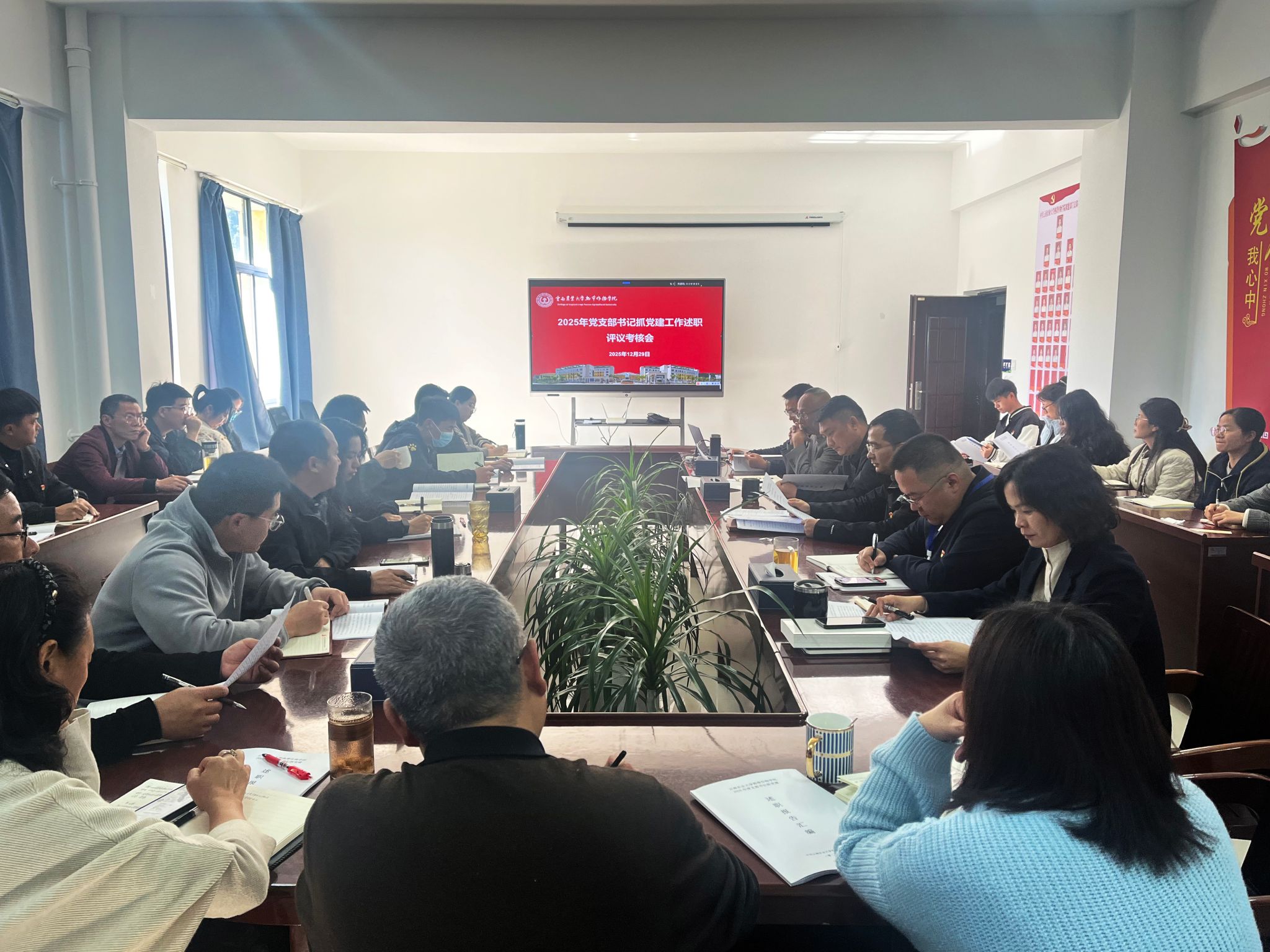 2025年12月29日,热带作物学院组织召开2025年度党支部书记抓党建工作述职评议会暨2025年第九次党支部书记工作例会。学院党委委员、各党支部书记及党员代表共计47人参加会议,会议由学院党委书记湛方栋主持。