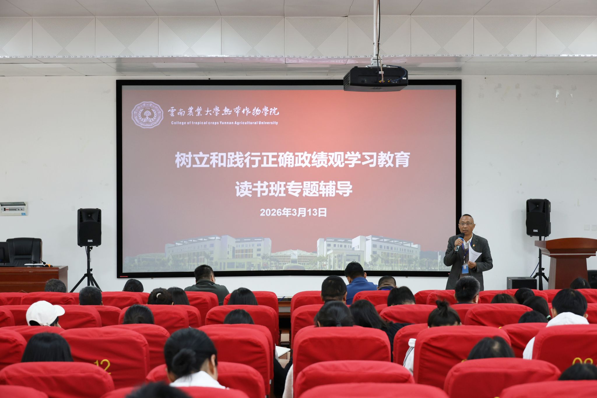 为推动学院树立和践行正确政绩观学习教育走深走实,2026年3月13日,热带作物学院举办树立和践行正确政绩观学习教育读书班,学院领导干部及师生党员共300余人次参加学习,党委组织员、工会主席周兴明主持开班式并作动员。