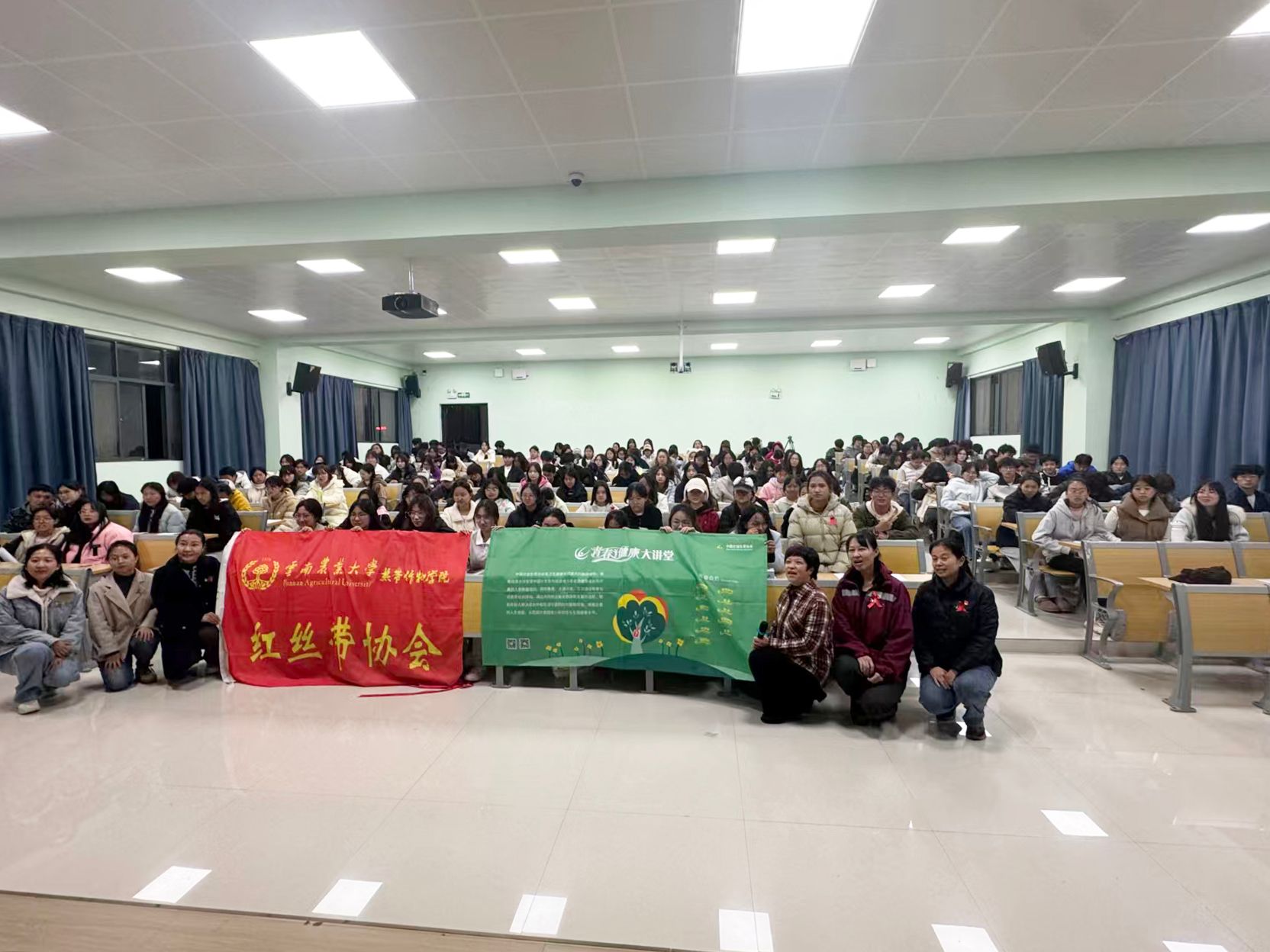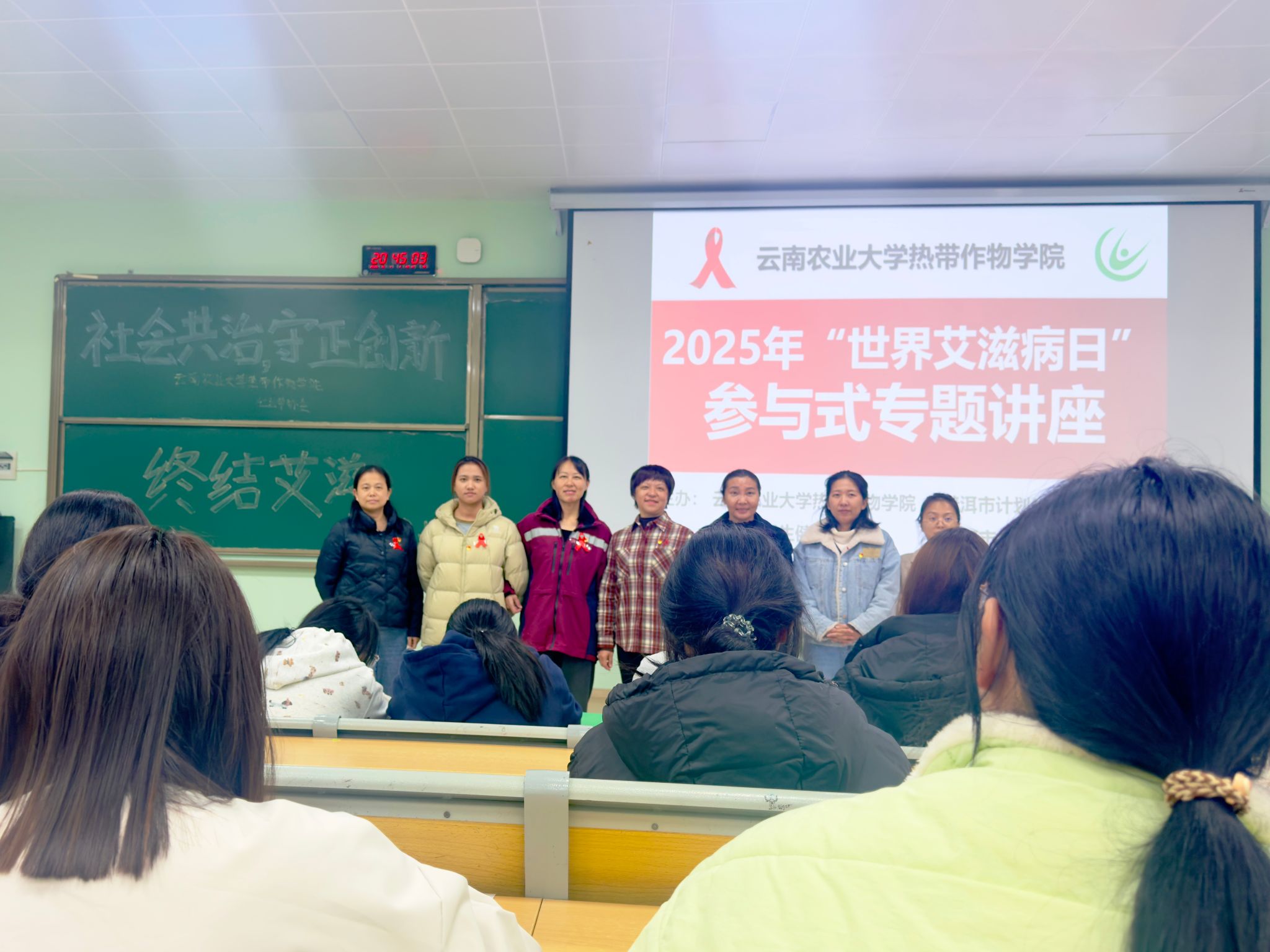2025年12月1日是第38个世界艾滋病日,热带作物学院以“社会共治 守正创新 终结艾滋”为主题的参与式专题讲座在喜礼楼二楼成功举办。讲座特邀请普洱市计划生育协会专职副会长许多担任主讲人,普洱市疾病预防控制中心、普洱市中心血站等单位及学院200余名师生共同参与。