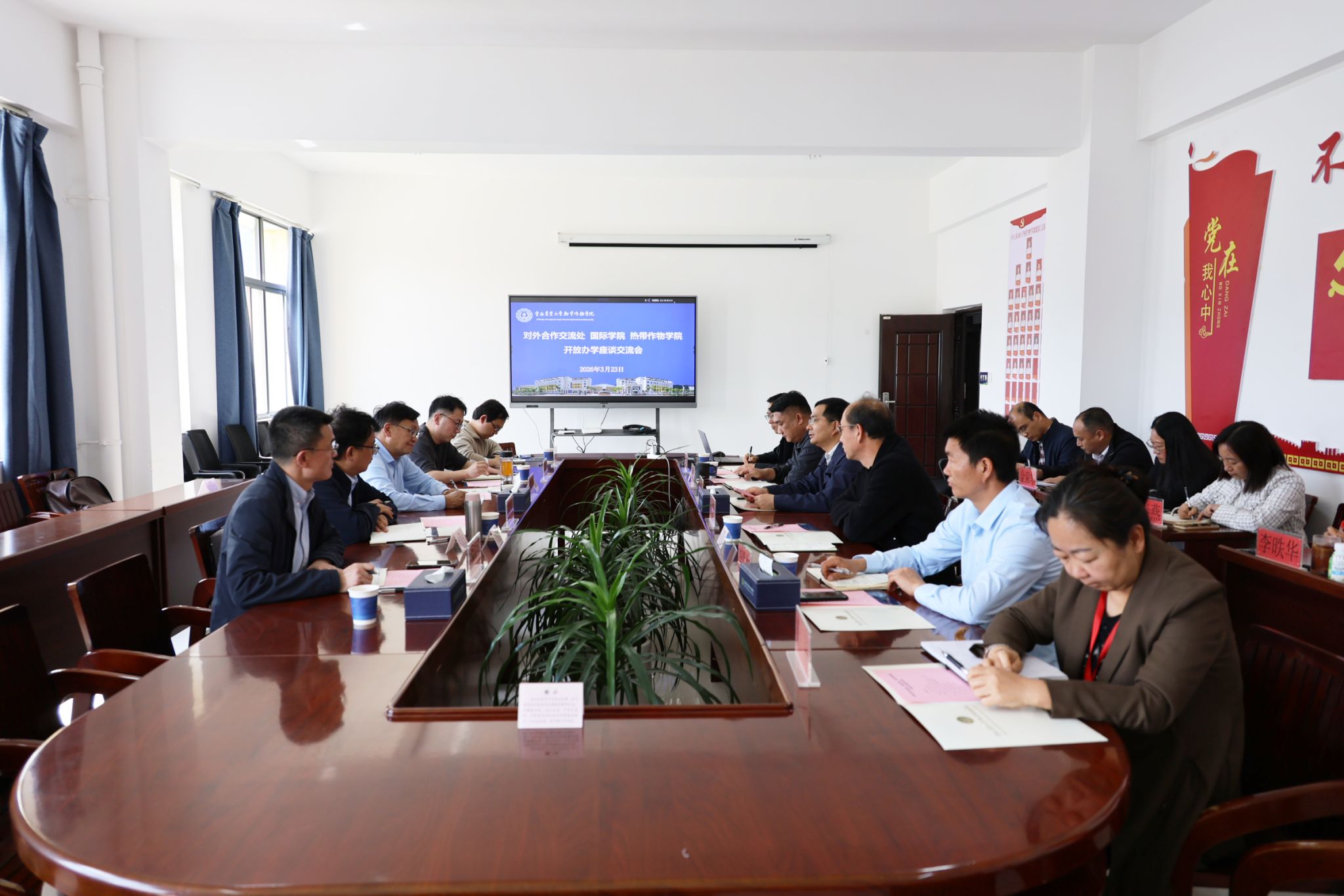 为进一步提升学院国际化办学水平,推动国际培训、国际科研合作及中外合作办学等工作提质增效,2026年3月23日,学校对外合作交流处处长朱耀顺、国际学院党委书记毕保良一行五人到热带作物学院调研指导并召开座谈会。学院党委书记湛方栋、院长杨学虎、党委副书记李晶晶、副院长李学俊和相关部门负责人参会。会议由湛方栋主持。